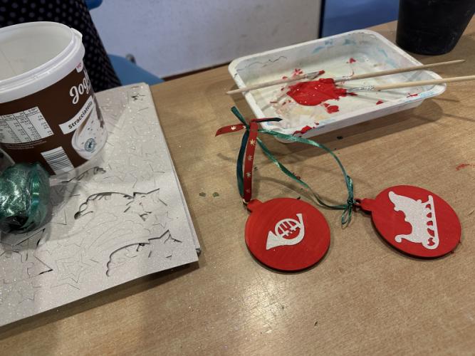 Am nächsten Tag haben wir alles angemalt, anschließend wieder trocknen lassen. Dann haben wir die Löcher sauber gebohrt, um Lederbänder durchzuziehen.
